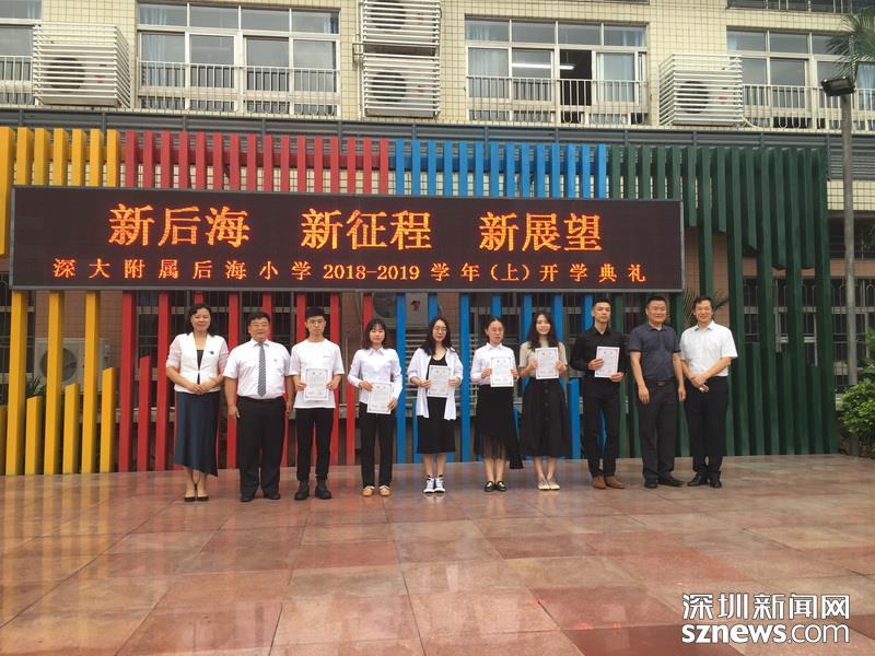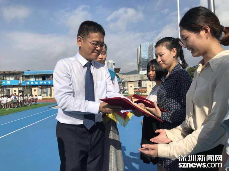 开学典礼上,学校领导为进校园开展“双师同课”的深大优秀学子颁发聘任证书。