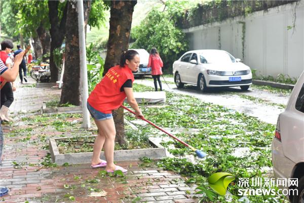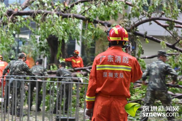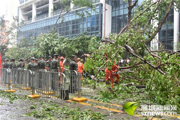 太宁路上由于树木倒伏数量过多已被封路,部队人员前来支援加快处理。