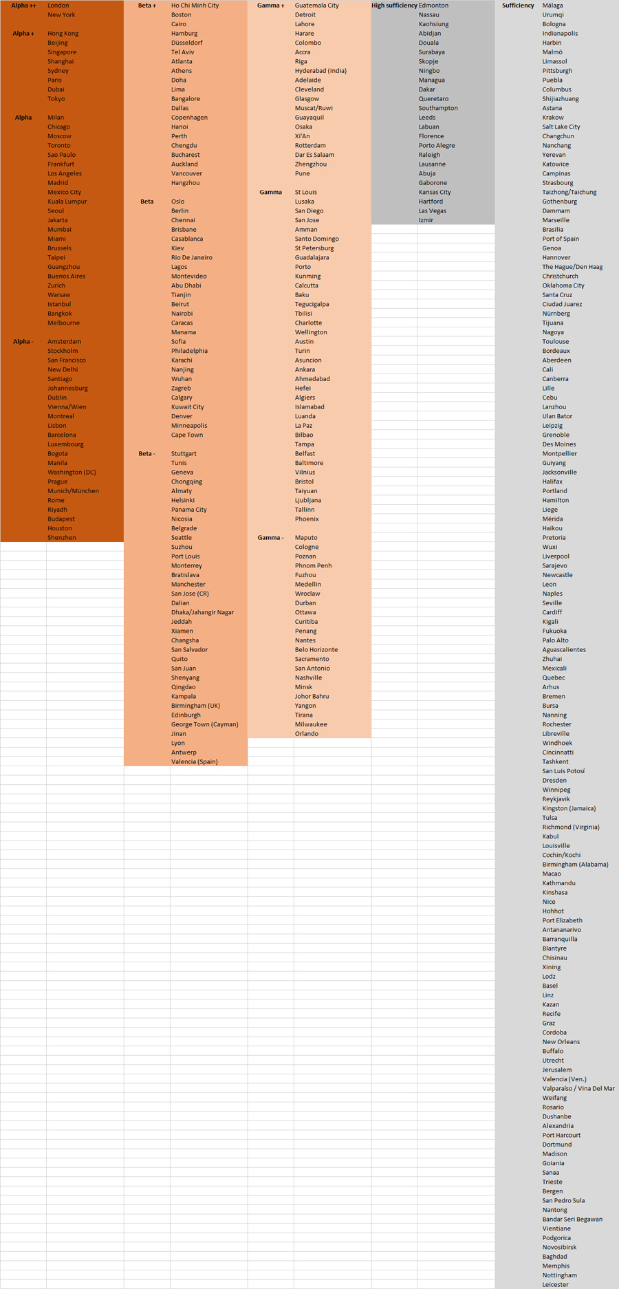 Alpha:米兰、芝加哥、莫斯科、多伦多、圣保罗、法兰克福、洛杉矶、马德里、墨西哥城、吉隆坡、首尔、雅加达、孟买、迈阿密、布鲁塞尔、台北、广州、布宜诺斯艾利斯、苏黎世、华沙、伊斯坦布尔、曼谷、墨尔本