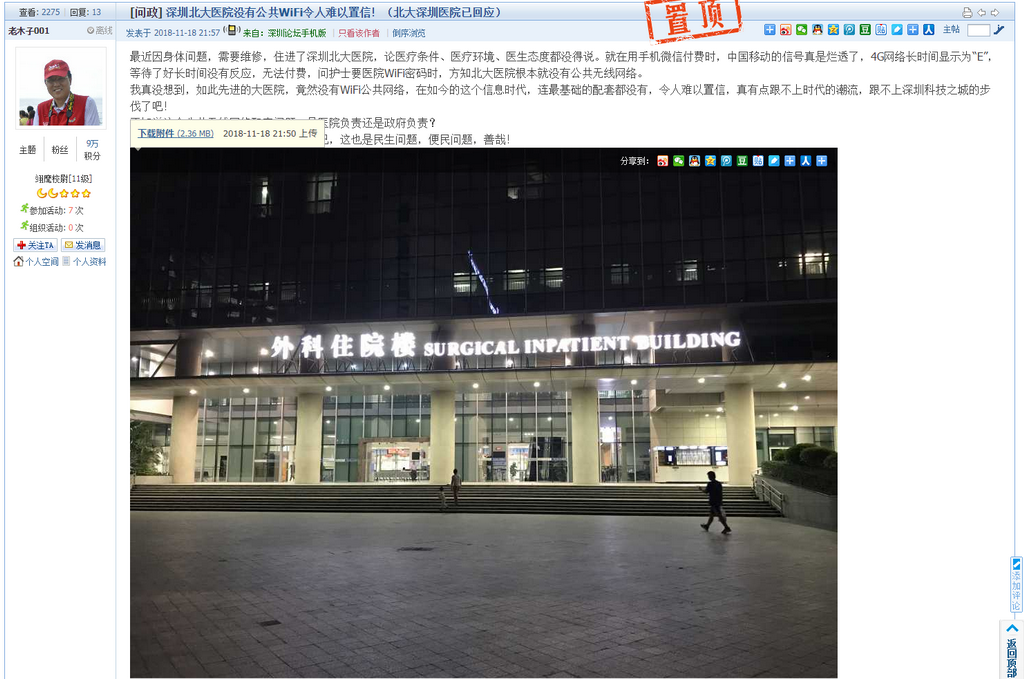 深圳新闻网11月20日讯(记者 刘婷)“北大深圳医院竟然没有公共WiFi?令人难以置信!”近日有网友“老木子001”在深圳论坛发帖称,使用手机微信付费时,发现北大深圳医院居然没有公共无线网络。(网帖地址:https://szbbs.sznews.com/thread-3821767-1-1.html)。