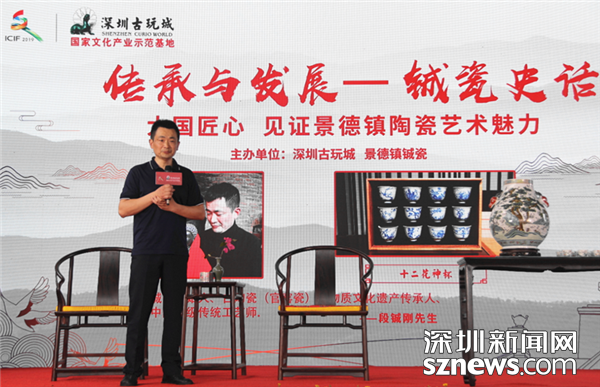 深圳新闻网讯(记者 李慧 通讯员 佘淑贤)5月16日,深圳古玩城举行“传承与发展——景德镇铖瓷史话”活动,特邀铖瓷创始人、古陶瓷(官窑瓷)非物质文化遗产传承人、中国高级传统工艺师段铖刚大师,与现场观众共同领略景德镇陶瓷艺术魅力。