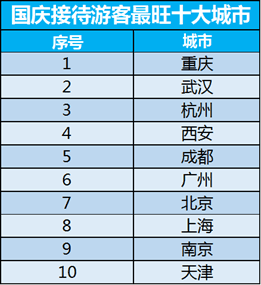 根据往年国庆游客接待数据,结合在线搜索预订人气,携程旅游大数据实验室预计,从全市接待人数看,今年“国庆旅游接待人气最旺十大城市”预计是:重庆、武汉、杭州、西安、成都、广州、北京、上海、南京、天津。重庆去年国庆接待游客超过3000万人次,今年有望继续成为接待游客量最多的城市。