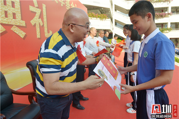 毕业于布吉中学、现任深圳市百合控股集团有限公司董事长凌国强(左)为学生颁奖。
