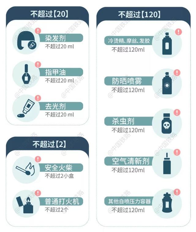 另外,生活中常见的指甲油、染发剂、发胶、空气清新剂等物品都属于限量携带物品,只能在规定剂量以内携带。如市民不清楚铁路规定,携带危险物品或限制物品到站乘车,应及时和民警或车站工作人员取得联系,便于妥善处理,确保旅行安全。