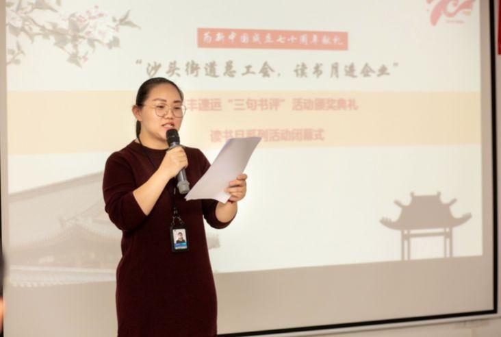 近日,沙头街道总工会“读书月进企业”活动走进顺丰速运,开展三句书评大赛。顺丰职工踊跃参与,浓缩成的三句书评,每一句都精练,深入灵魂。最后,在众多的书评中,经过评委们集体评议,评选出一、二、三等奖和优秀奖作品,并举行了颁奖典礼。职工们的才华得到了大家的认可,还获得了奖项,他们表示非常开心。