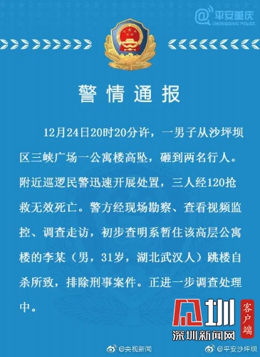 见圳客户端·深圳新闻网2019年12月27日讯(见圳客户端、深圳新闻网记者 张玲)12月24日晚,重庆市沙坪坝区一男子从某公寓楼高坠,砸死两名路人。经警方查明,排除刑事案件,男子李某(31岁)系跳楼自杀。有媒体报道指出,被砸身亡者系两名参加艺考的高中生。