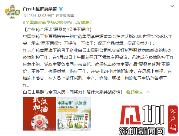23日当天,白云山星群成立了疫情防控工作小组,党政主要负责人靠前指挥,确保抗击疫情主要产品“ 夏桑菊系列 ”不提价,不停供,确保质量、供应工作,并安排 24 小时值班制度,在思想上重视,在措施上落实,在人员上做好采购、生产、仓储、调拨、物流和卫生防范各项准备工作,并公开发布夏桑菊保供不提价官宣。