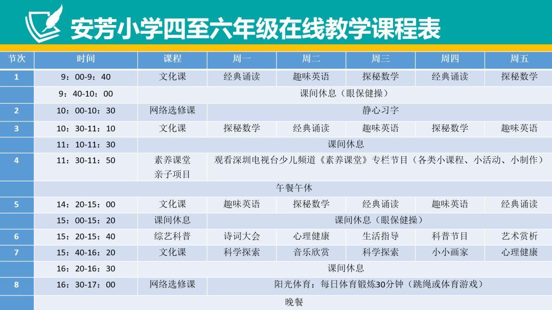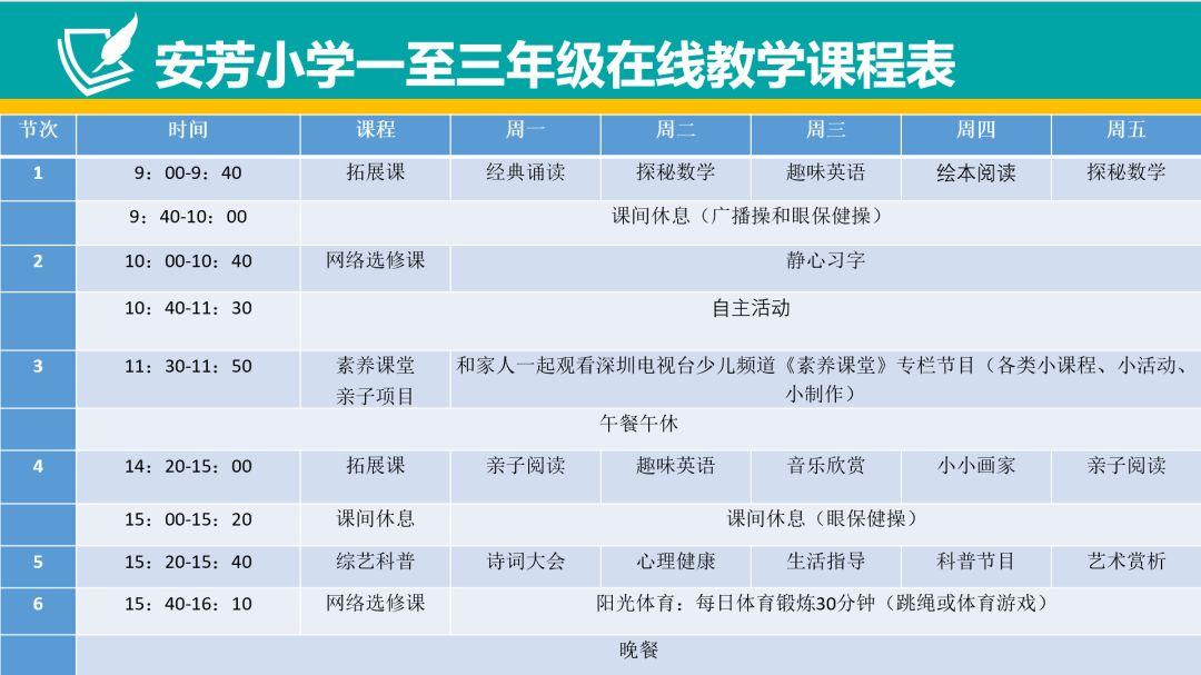 学校在线学习课程安排传承学校本真课堂理念,开设经典诵读、探秘数学、趣味英语、静心习字、亲子阅读、小小画家、音乐欣赏、综艺科普等丰富的课程,供各位同学家长选择。在此期间,家长和同学们也可在家开展一些如亲子交流、手工制作、研究性学习等活动,保证每天学习不少于1小时,要切实加强体育锻炼、每天至少一次广播操、2次眼保健操并适当开展室内运动,保证每天运动一小时,要积极参加家务劳动,培养良好劳动习惯。