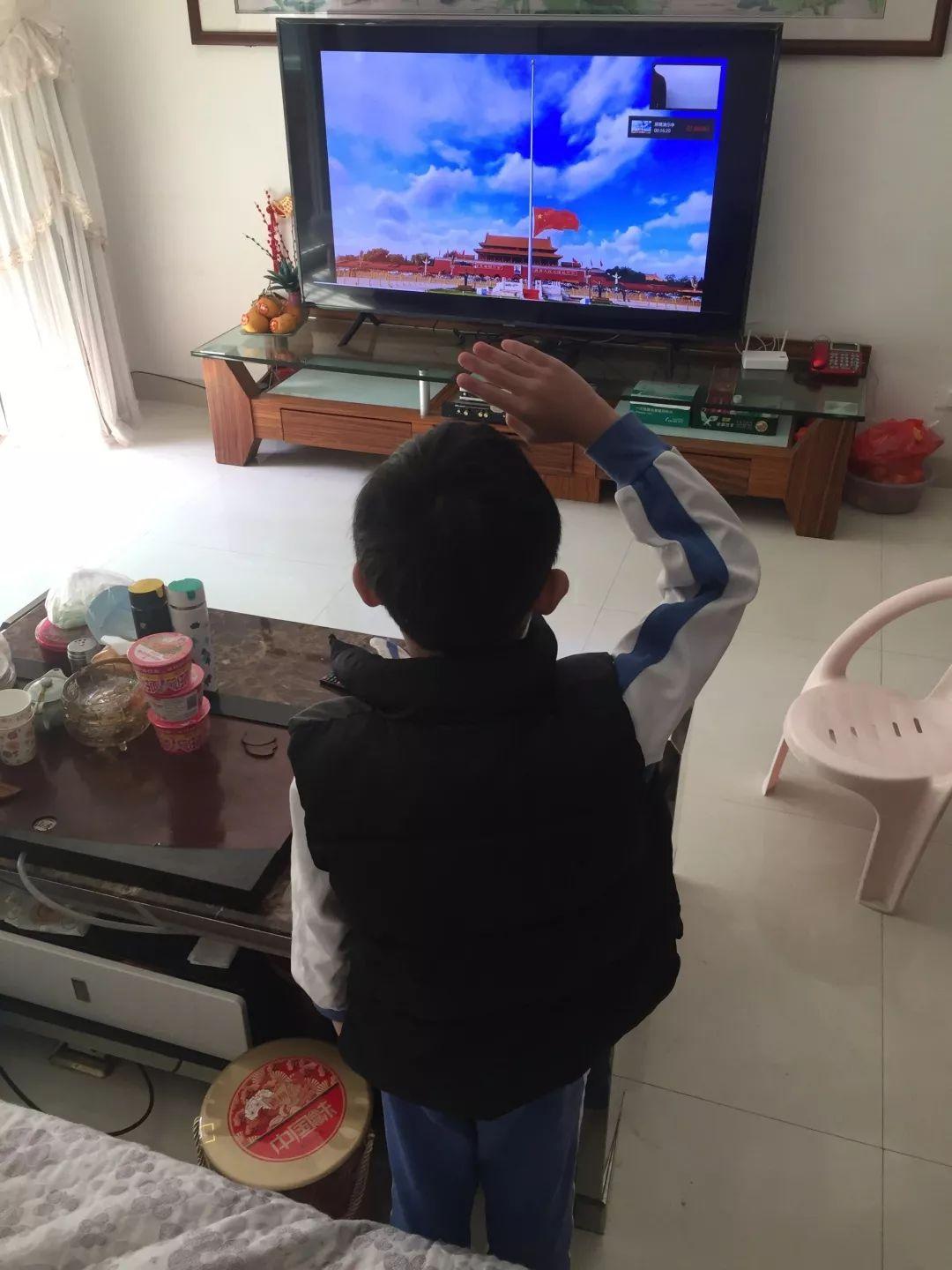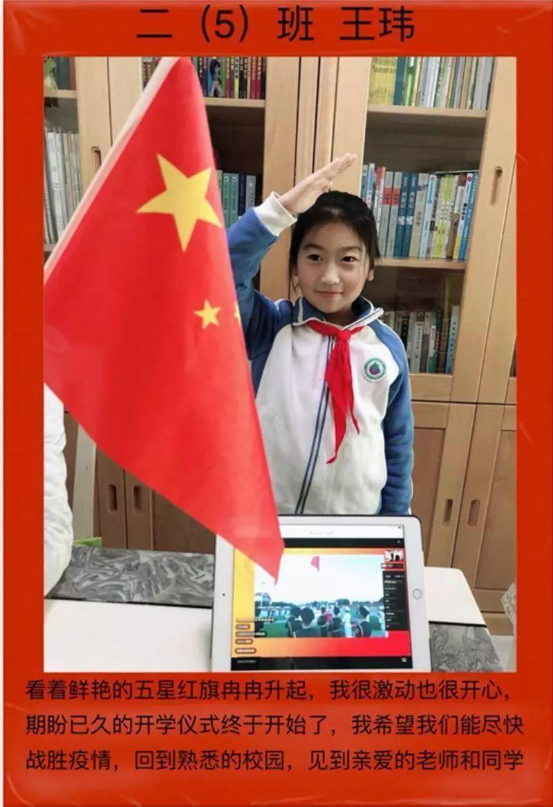 “在这样的非常时期迎来了开学的第一课,当五星红旗在电脑屏幕里冉冉升起,孩子腰杆挺直,庄严肃穆地行了敬礼仪式。正如朱先云校长在开学致辞里提到的,哪有岁月静好,只是有人为你负重前行。孩子,现在的经历,就是你人生最宝贵的第一课。他日,背负岁月的重任将落在你的肩头,继续前行!”