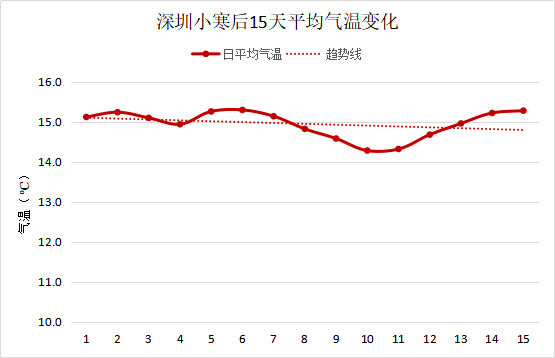 小寒当天的平均气温为15.1℃,历史上最高气温是26.9℃,出现在2015年,最低气温出现在1977年,为2.6℃。根据1953-2020年的数据资料,小寒后15天深圳的平均气温在14.9℃,平均最高气温为19.7℃,平均最低气温为11.7℃,气温总体呈下降趋势。小寒时节深圳出现10℃以下寒冷天气平均有5天,历史上曾出现持续寒冷天气13天,出现在1976年。