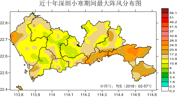 从近十年深圳小寒期间最大阵风分布图看出,深圳最大阵风主要在大鹏新区和盐田区,沿海和高地最大阵风可达10-11级。