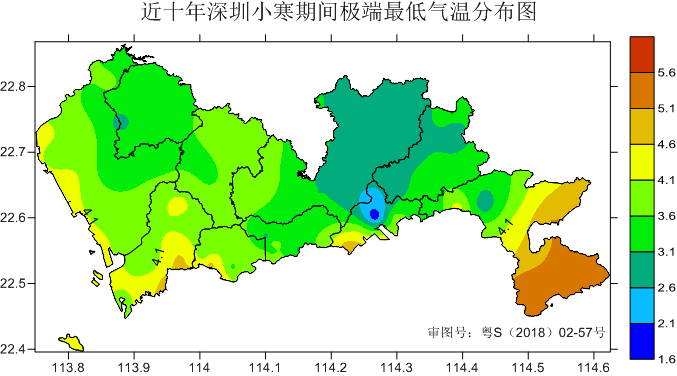 近十年,小寒时节深圳极端最低气温主要出现在盐田区北部(极端最低1.6℃)、龙岗区北部(极端最低2.8℃)和坪山区西部(极端最低2.8℃)。