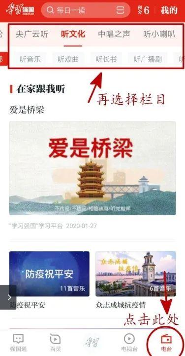 点开“学习强国”APP,在页面底部点击“电台”,就能进入啦~最推荐的就是“央广云听”、“听文化”和“听小喇叭”这几个栏目了。