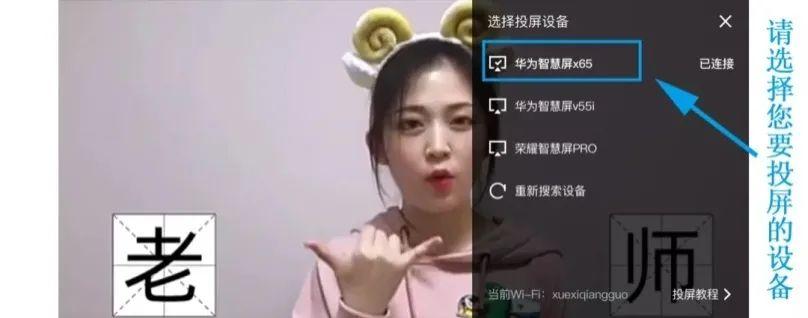 第三步,在弹出的菜单中点击要投屏的设备,投屏成功后即可在电视上观看视频节目。