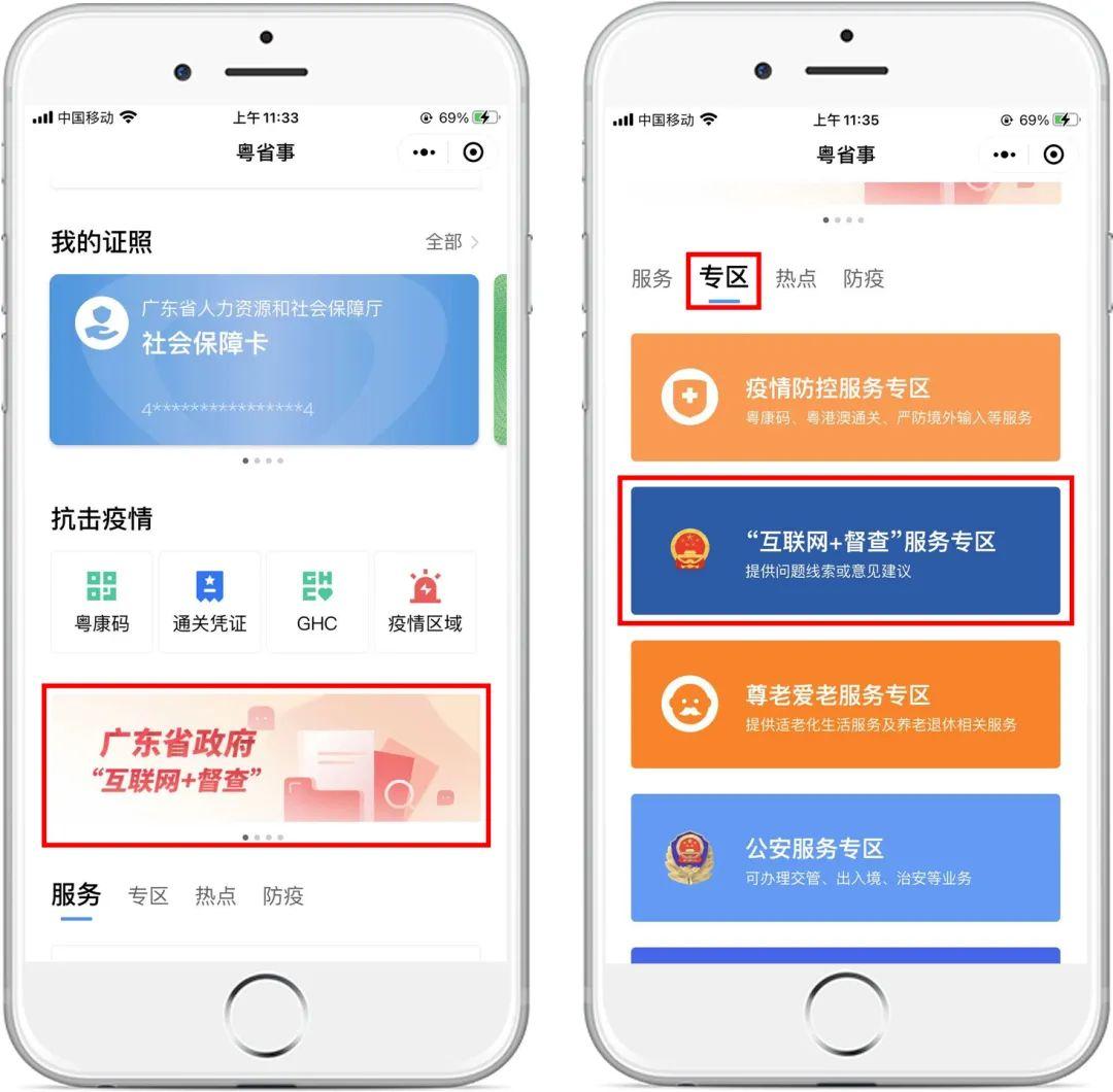 微信搜索登录“粤省事”小程序,点击首页轮播图“互联网+督查”,或点击“专区”-“互联网+督查服务专区”进入服务。