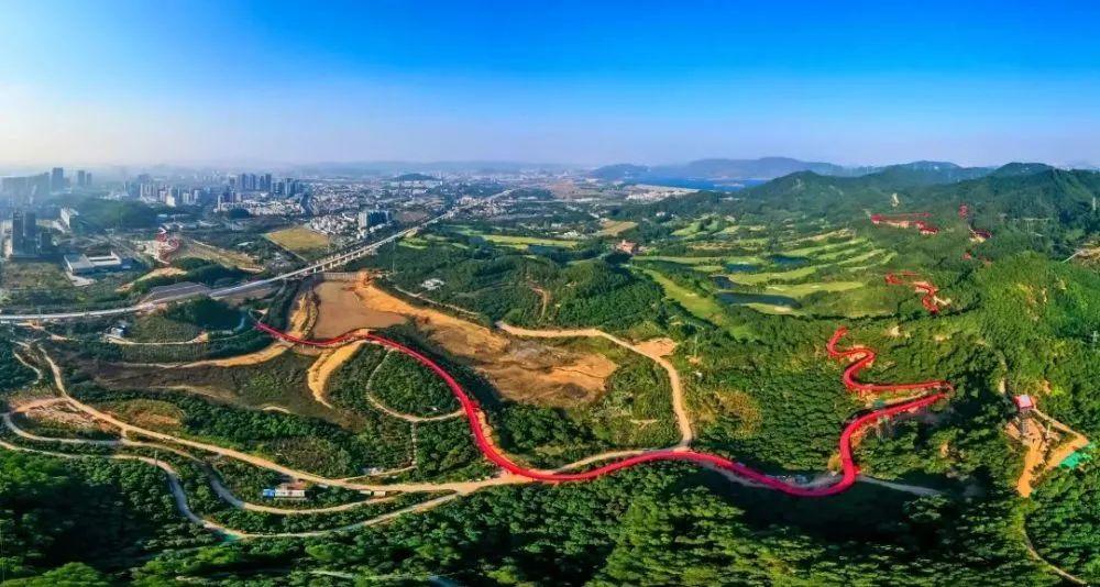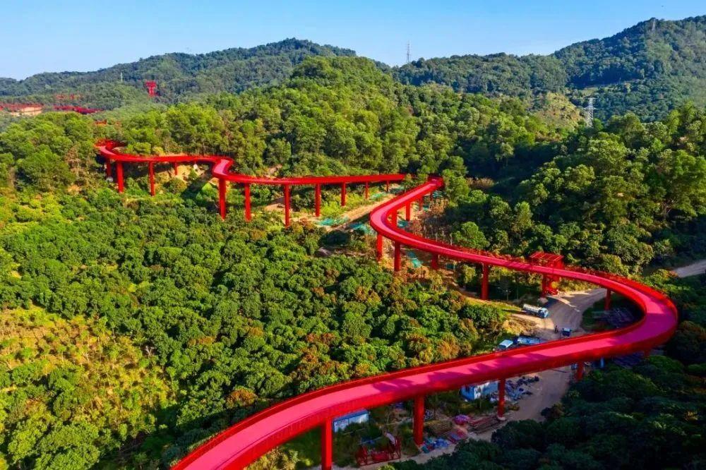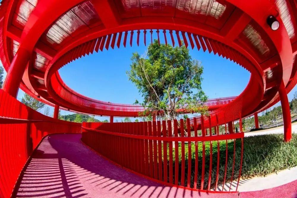 光明新地标。红桥如一条亮眼的红色飘带牵动满目苍翠,“光明红丝带”,是运动森林公园的亮眼名片。它西起新城公园,东接马拉松绿道,钢结构架空段3.55公里,串联光明中心城区,是非常火热的网红打卡点噢,拍照超好看!