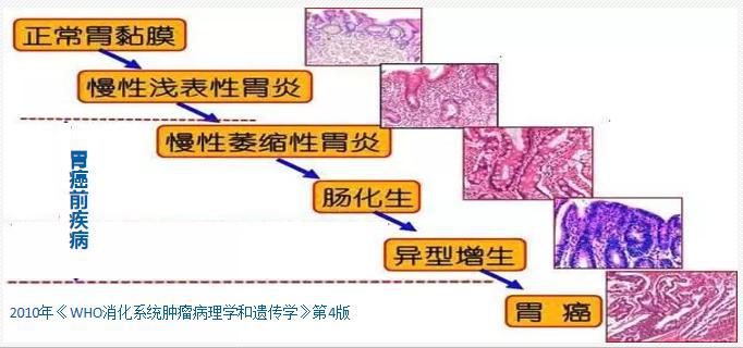 大多数胃癌遵循从正常胃黏膜→浅表性胃炎→萎缩性胃炎→肠化生→异型增生→胃癌的演变发展过程。