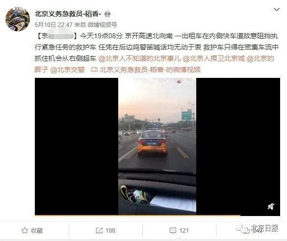 针对网传“京开高速一出租车阻挡救护车”的情况,经警方调查,2021年5月10日19时许,涉事司机贾某(男,37岁)驾驶出租车行驶至京开高速(进京方向)西红门收费站北侧附近时,在明知后方有救护车鸣警报示意其避让且具有避让条件的情况下,依然阻碍执行紧急任务的救护车通行。5月12日,贾某被大兴警方依法处以行政拘留5日处罚。