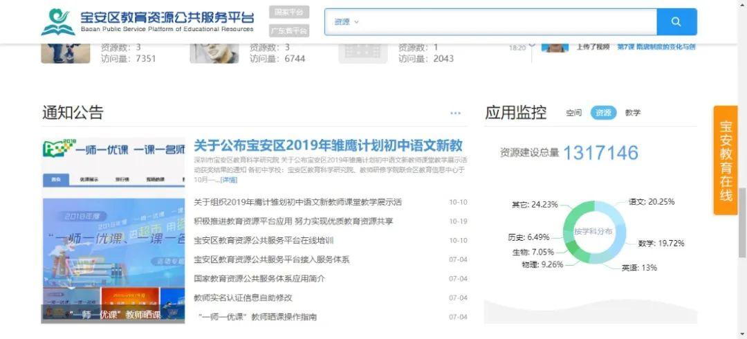 2016年宝安率先在全市集约化部署教育资源公共服务平台,与广东省粤教云互联互通,融入国家教育资源公共服务体系,汇聚了教研、名师、区域特色、K12学科等资源。平台本土生成性资源总量超过228.3万个,访问量达757万人次,师生、家长注册用户超120万人,空间开通率达100%,宝安优质教育资源已走进千家万户。