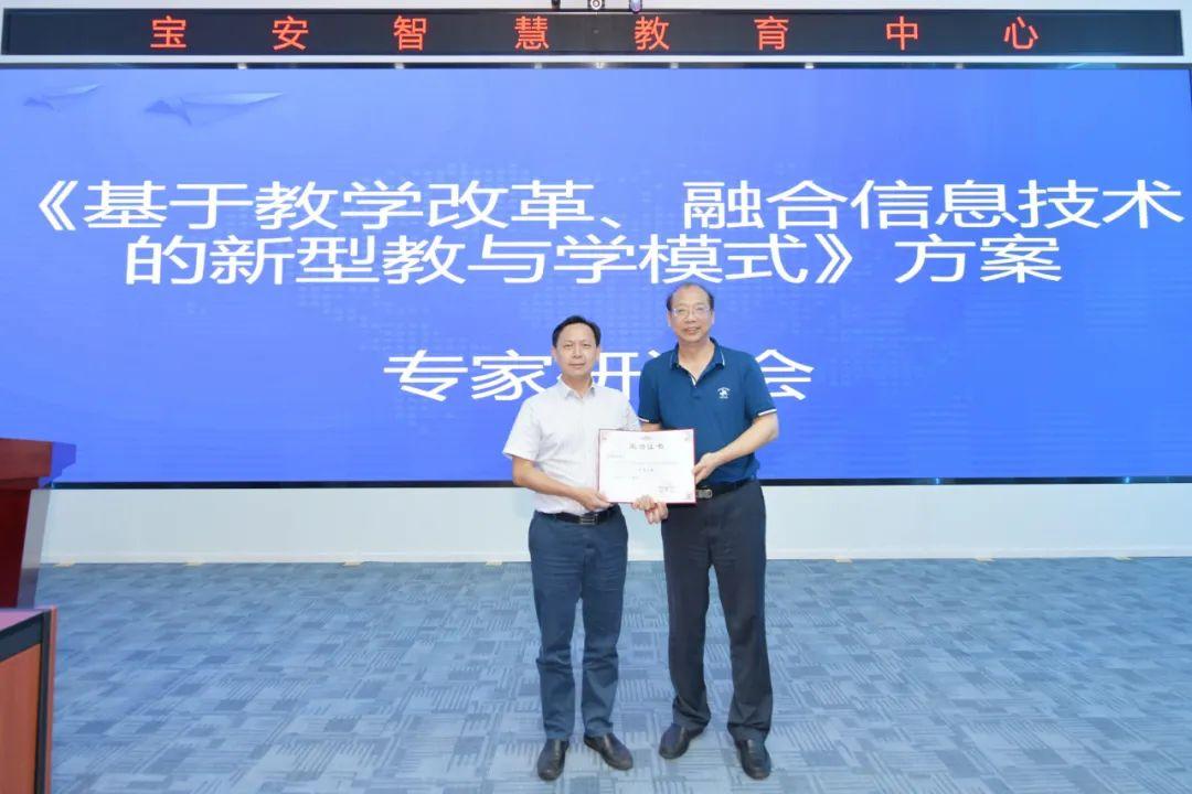 启用仪式前广东省教育厅教育技术中心主任唐连章为宝安区荣获“广东省网络学习空间应用优秀区域”、“广东省’学校网络安全’”示范区授奖。现场还召开了《基于教学改革、融合信息技术的新型教与学模式》方案专家研讨会。