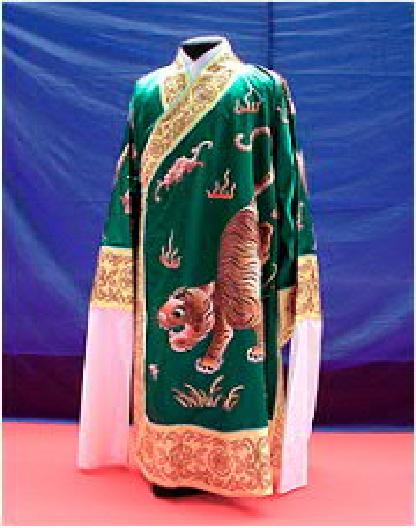 官衣亦称圆领,是文武官服, 腰掛玉带,胁下有胁摆,胸前及背后各钉上一块方形丝绣補子。