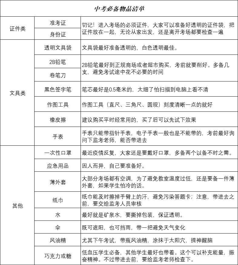 一些中考考试必备物品的清单