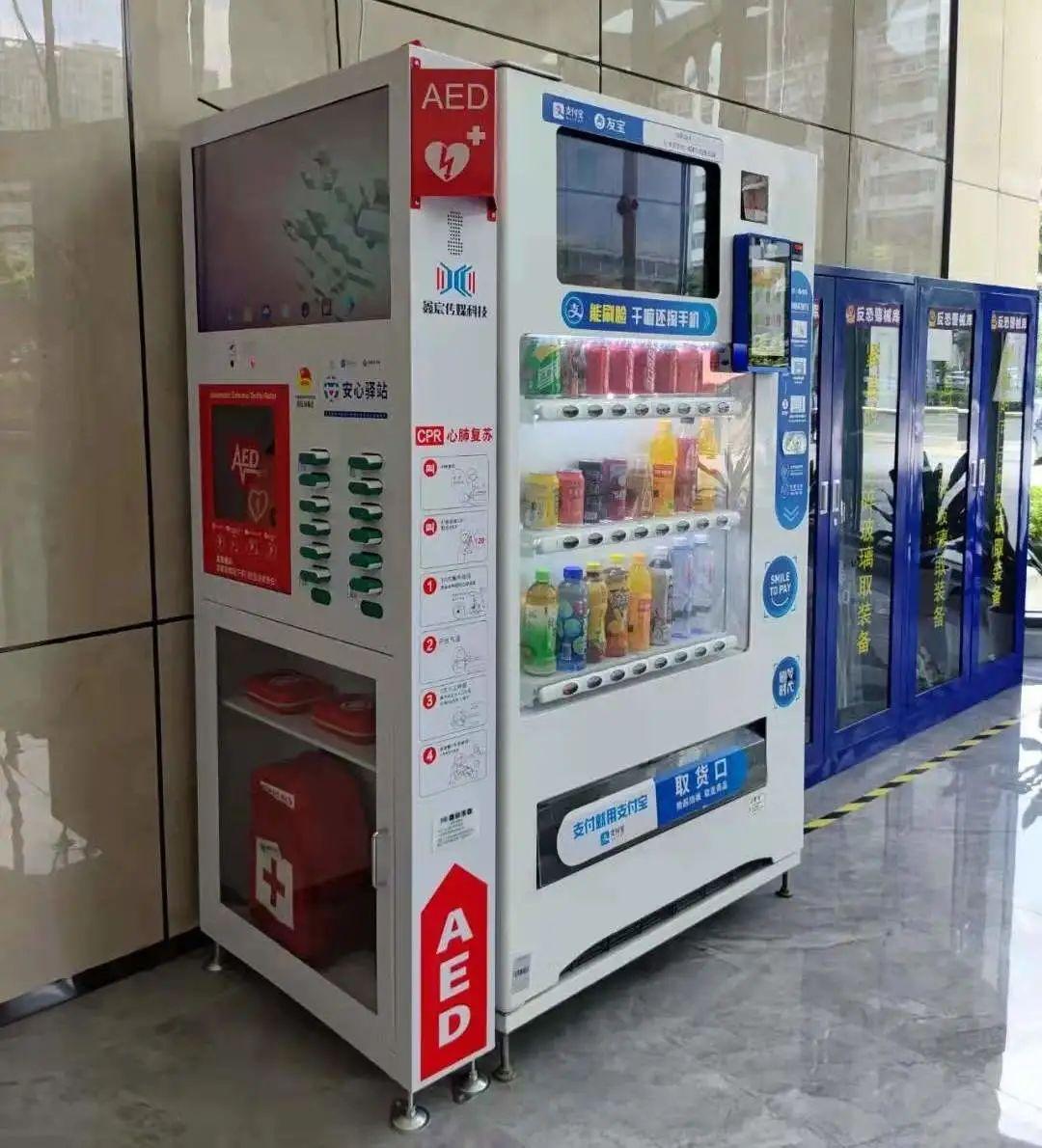 在深圳街头,随处可见这样“特别”的智能售货机,除了提供水与饮料等饮品外,还配备了救命神器AED与应急物资包。据了解,这是由深圳市城市公共安全技术研究院、深圳市公共安全义工联合会研发的“急救守护+减灾救灾”新产品——“安心驿站”。