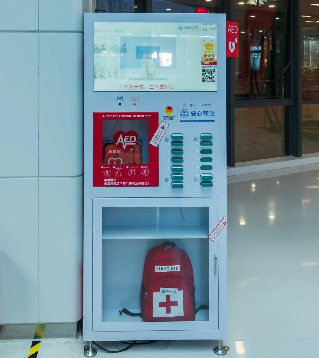 这款创新推出的“安心驿站”,在结合智能售货机的功能基础上,以公益形式配备了救命神器AED和应急物资包,能够在出现意外的第一时间提供应急救护和应急物资供应,保障群众生命安全。