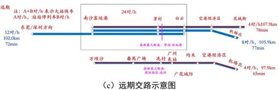 环评报告显示,南至深圳、北至白云机场的22号线会开行多种线路。初期计划开行4种线路:深圳、东莞至白云(棠溪)站(大站停),用时69分钟;深圳、东莞至白云(棠溪)站,用时81分钟;南沙客运港至白云机场北(大站停),用时72分钟;南沙客运港至白云机场北,用时89分钟。