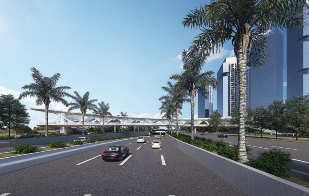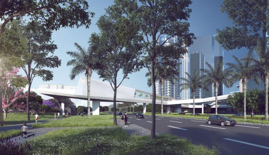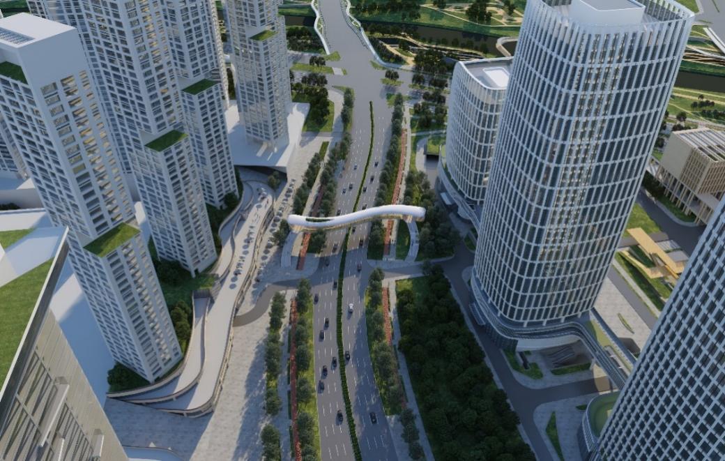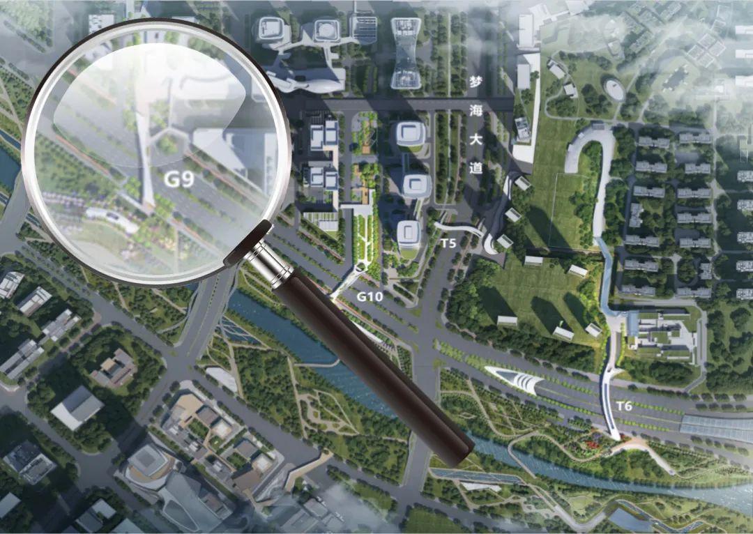 T5过街天桥横跨已建成的梦海大道,西侧为城市公共绿地,毗邻民生地块,包含商业及办公功能;东侧为地铁上盖物业5号地块,包含住宅功能及配套商业与车库裙楼。