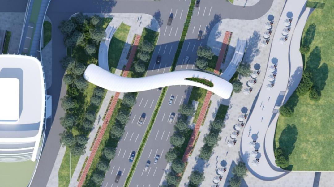 一叶方舟,擘画未来。桥梁形态取形于芭蕉叶,结合流畅的曲线塑造桥身科技感,如同一叶前行的方舟,象征远大未来的美好寓意。