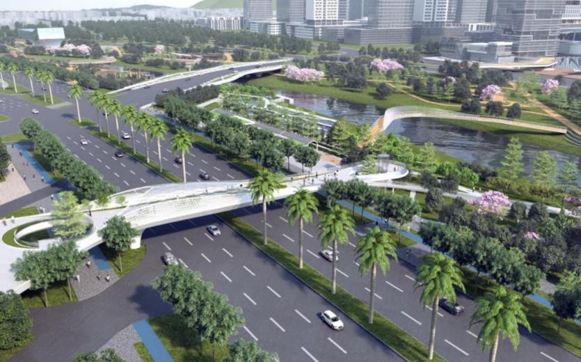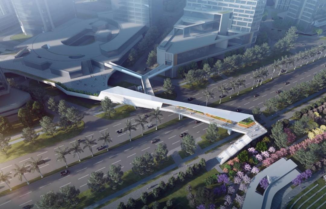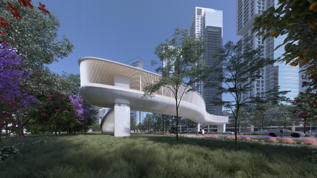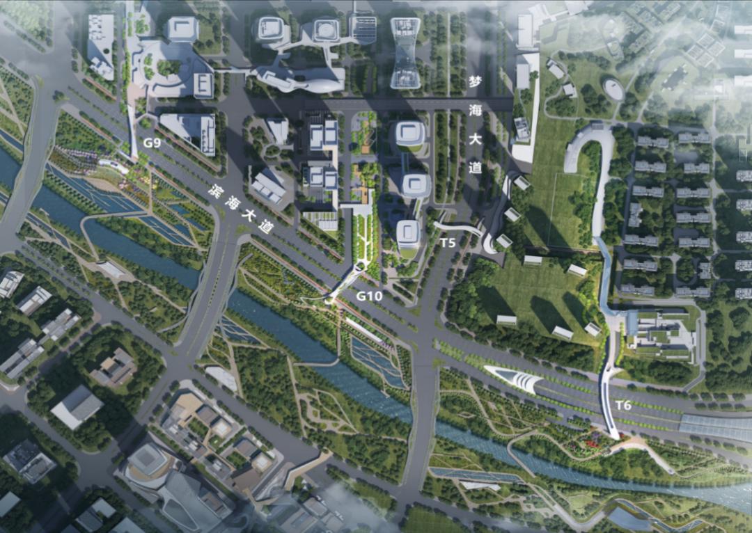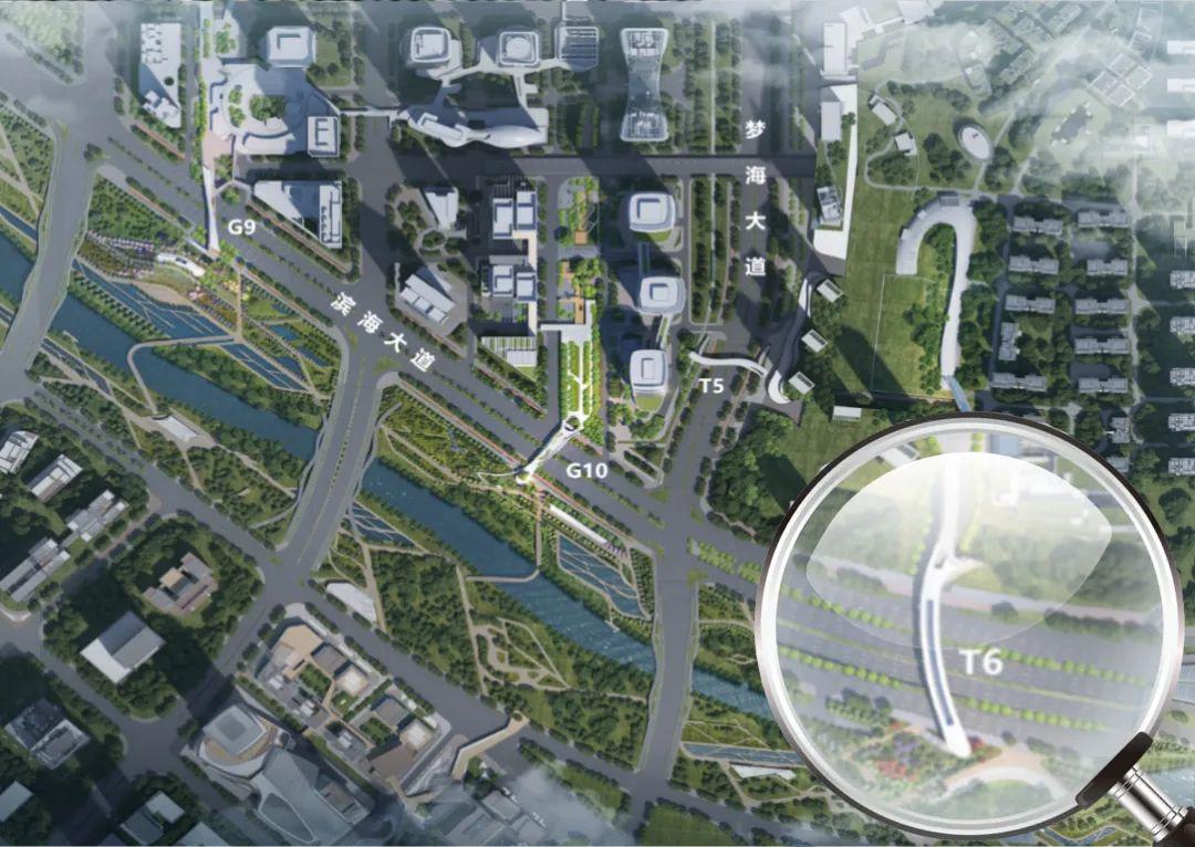 其中3座横跨滨海大道,连接各地块建筑与桂湾公园,自西向东分别是跨街公园G9、G10与过街天桥T6,另一座过街天桥T5位于梦海大道上方,连接民生地块与前海时代地块。