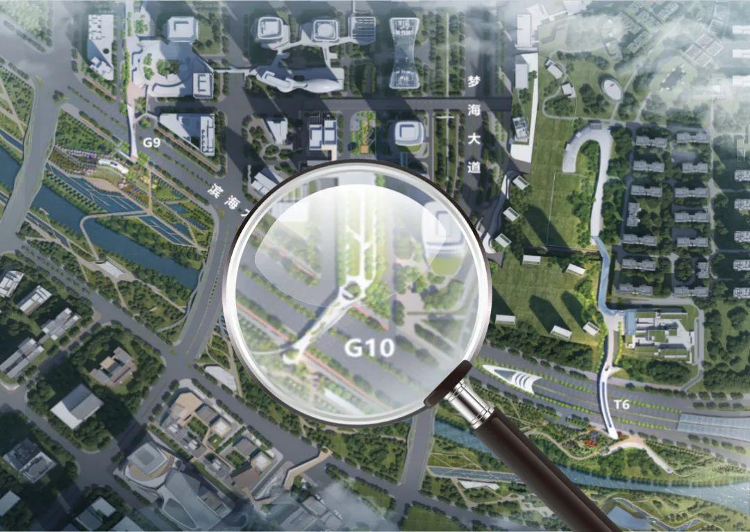 G9跨街公园横跨已建成的滨海大道,北侧为冠泽地块,商业裙楼部分预留有与G9联系的平台,南侧为桂湾公园及其服务建筑一。