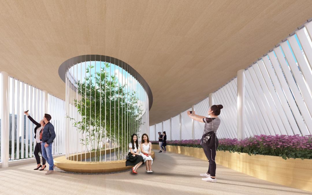 桥内部空间设计风格现代简练,与桥内绿化、座椅等休闲空间共同营造出科技化、未来化的视觉空间体验。