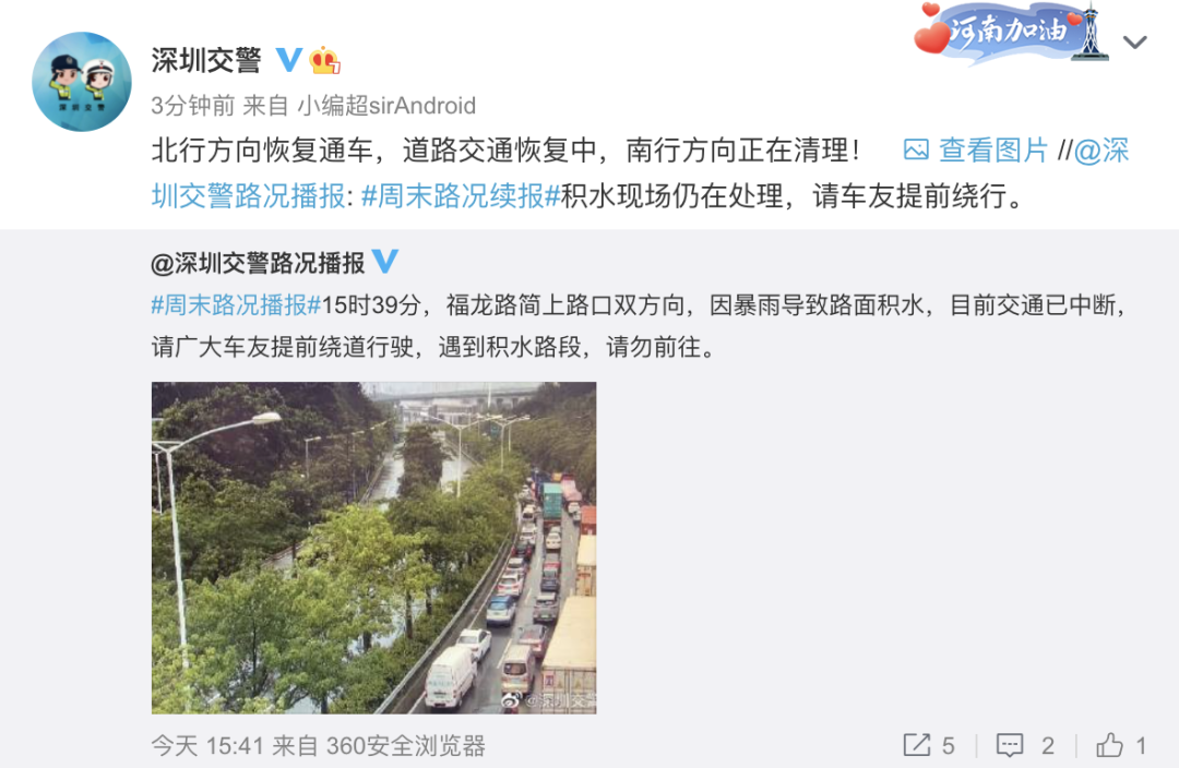 @深圳交警19:07消息:北行方向恢复通车,道路交通恢复中,南行方向正在清理!