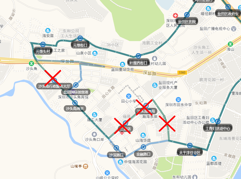 往深圳外国语学校方向取消“沙头角邮局、三家店、沙头角海关、沙头角行政服务大厅”等4个单边公交停靠站,增加“金融路口、沙深路口,盐田国际创意港”等3个单边公交停靠站。