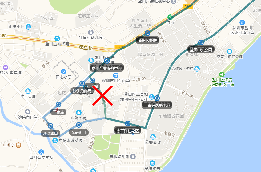 双方向增加“盐田港西地铁站①”1对公交停靠站,往福宁总站方向取消“官下路”1个单边公交停靠站,增加“金融路口、沙深路口、三家店、沙头角邮局”等4个单边公交停靠站。