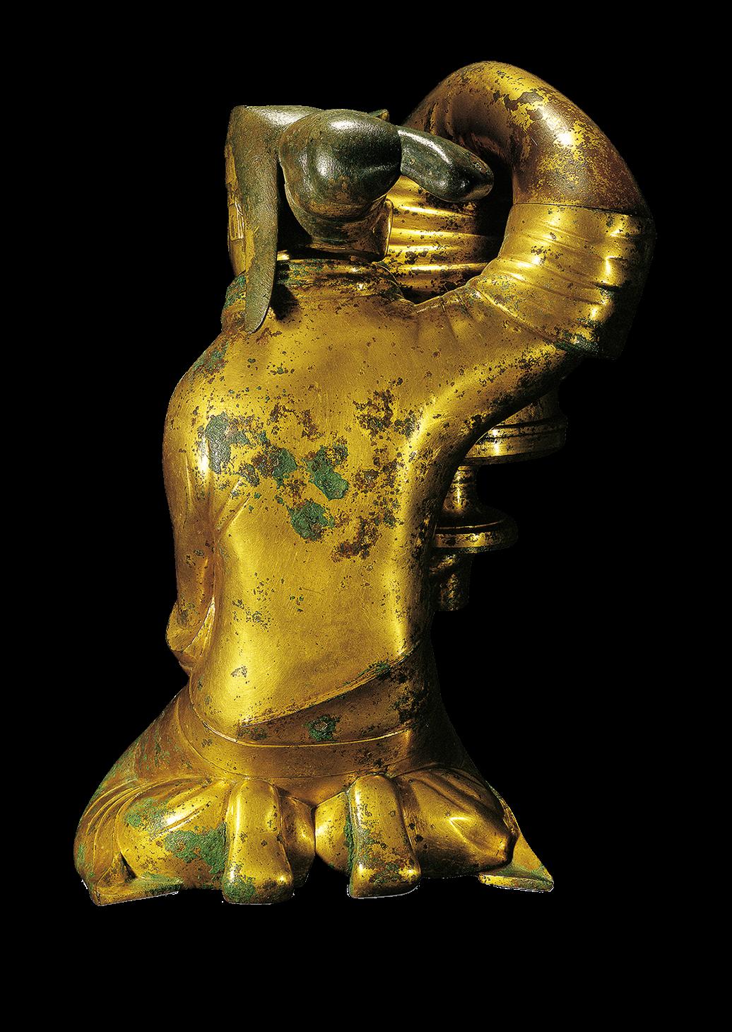 整体造型为一名跪地持灯的汉代宫女形象,头梳髻,发上覆簂(guó,即巾帼),身穿曲裾深衣。右臂高举,宽大的袖管自然下垂,巧妙地形成灯罩的顶部。灯内中空,燃烧时产生的烟尘顺着袖管进入灯体内,可有效防止空气污染。灯盘可转动,灯盘屏板可推动开合,以调整光照亮度和角度。全灯共刻有“长信尚浴”“阳信家”等铭文共9处,可以看出此灯的所有者几经变更,最后辗转到窦绾手中。