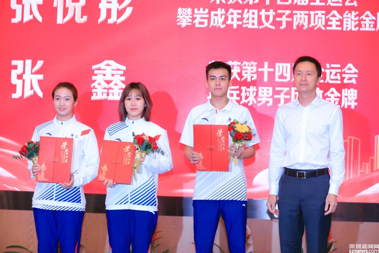 读特客户端•深圳新闻网2021年10月27日讯(记者 王志明)2021年9月21日,第十四届全国运动会乒乓球男团决赛在陕西延安打响,西丽学校毕业生、广东省乒乓球队现役队员张鑫随广东队以3比1战胜由马龙领衔的北京队,夺得第十四届全国运动会乒乓球男子团体冠军。这是张鑫同学去年随队夺得全国乒乓球锦标赛男子团体冠军后,再一次站上全国冠军的领奖台。张鑫结束比赛后,回到深圳当天即回母校看望,并于10月9日下午,被南山区人民政府授予“南山体育事业杰出奖” 。