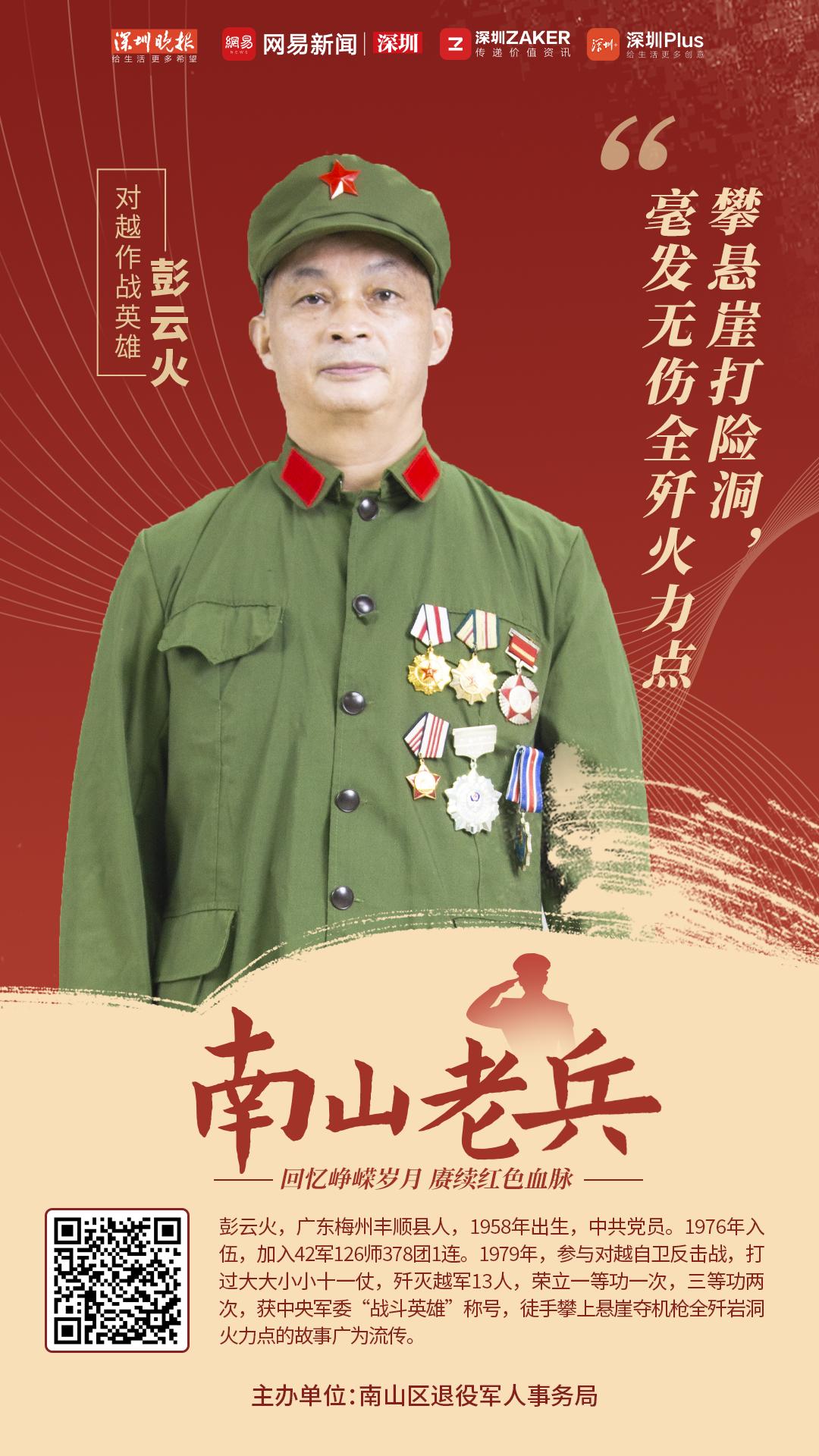 63岁的彭云火,年轻时参与对越自卫反击战,他徒手攀上悬崖夺机枪全歼岩洞火力点的故事广为流传,歼灭越军13人,荣立一等功一次,三等功两次,获中央军委“战斗英雄”称号。