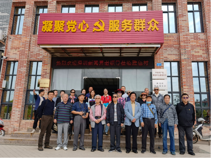 ↑深圳新闻界老同志在雅色村村委会前合影。(李广东 摄)