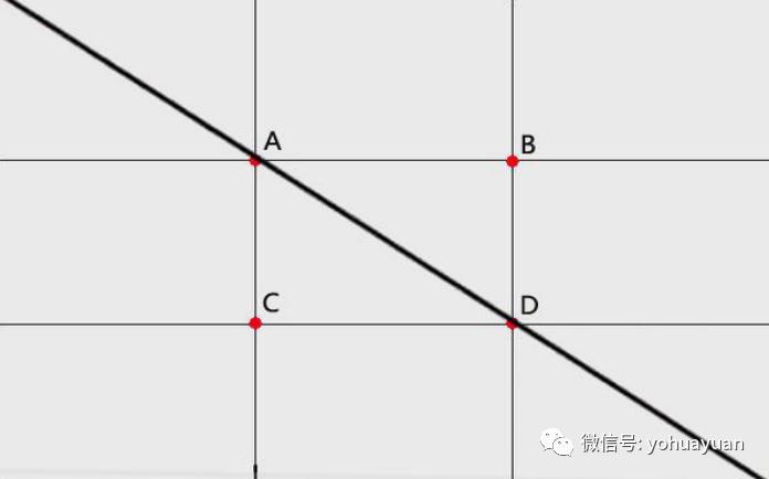 对角线构图法是在九宫格构图的基础上形成,四条分割线交汇形成的点ABCD,将斜对着的两点如图 AD 连线,就形成对角线构图。