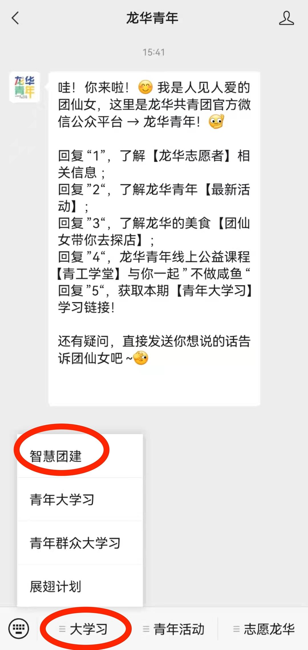 也可在“龙华青年”公众号菜单栏直接点击【大学习】【智慧团建】