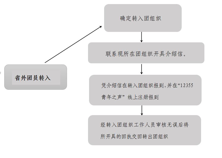 参考以上“省内团员转接流程”,明确自己的转入团组织,团员凭转出团组织开具的介绍信去转入团组织报到,并同时在微信公众号“12355青年之声”上进行团员线上注册报到,经转入团组织工作人员确认无误后进行线上审核、留存介绍信及开具回执。最后,团员应将团组织关系转接介绍信回执给到原转出团组织。