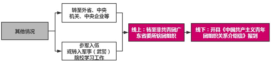 申请转至“非共青团广东省委所辖的团组织”,并准确填写团员去向;其余转接手续按照线下组织关系转接流程处理。