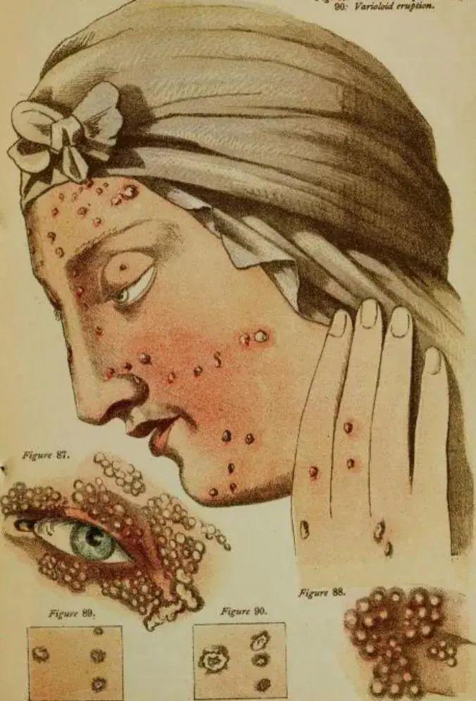 在临死前,得病的人会大量出血。皮肤像烧伤一样整片脱落,全身血肉模糊。即使侥幸活下来,也会留下满脸痘坑,甚至眼瞎耳聋。