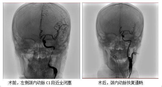 神经内科主任符鹏程判断患者为做成颈内动脉夹层,患者症状进行性加重,为了救治患者,再次启动急诊介入绿色通道,在麻醉师和介入室的配合下,通过30多分钟的奋斗,将闭塞的颈内动脉开通。