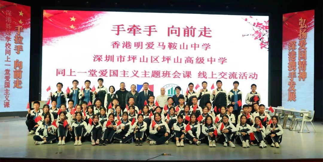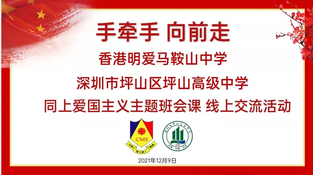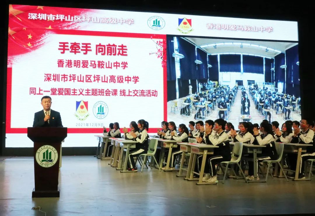 为进一步加强深港教育友好交流合作,深化两地师生爱国主义情怀,共商两校教育发展合作模式,12月9日,深圳市坪山区坪山高级中学和姊妹学校香港明爱马鞍山中学的师生们“手牵手,向前走”同上一堂爱国主义班会课。两校通过线上直播的形式,共同开展爱国主义教育交流活动。