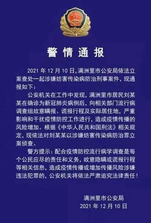 据中国新闻网12月12日消息,记者从内蒙古自治区满洲里市警方获悉,当地一名临床医师确诊后,因在流调时故意提供虚假住址、瞒报行程,被警方立案侦查,同时被满洲里市纪委监委开除党籍。