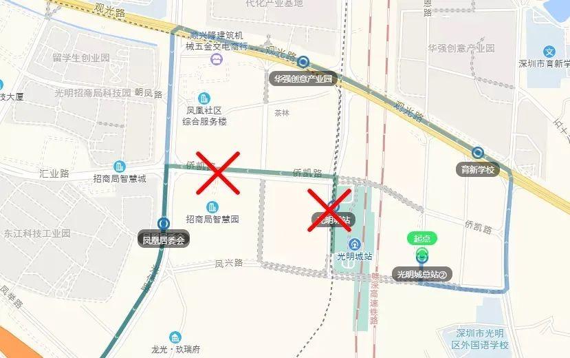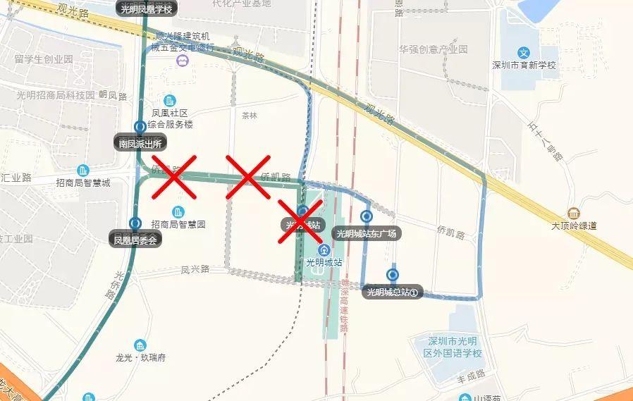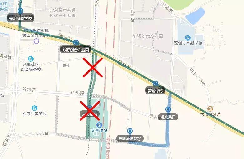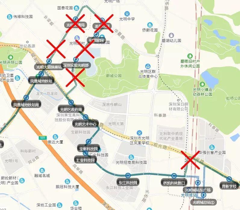 双方向取消“光明大道换乘站、光明交通局、美景花园、和润家园、深圳实验光明部”等5对公交停靠站。